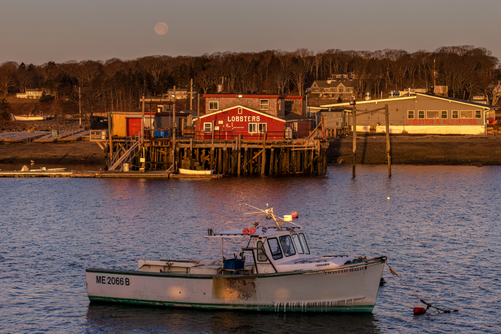 Notes: Sunrise behind me and the Snow moon setting behind Cooks Lobster and Ale House from the Cribstone Bridge.