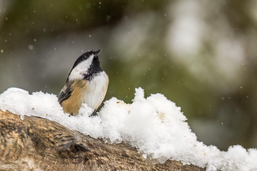 Notes: Black-capped chickadee on a Limb singing in the snow in my bird garden.