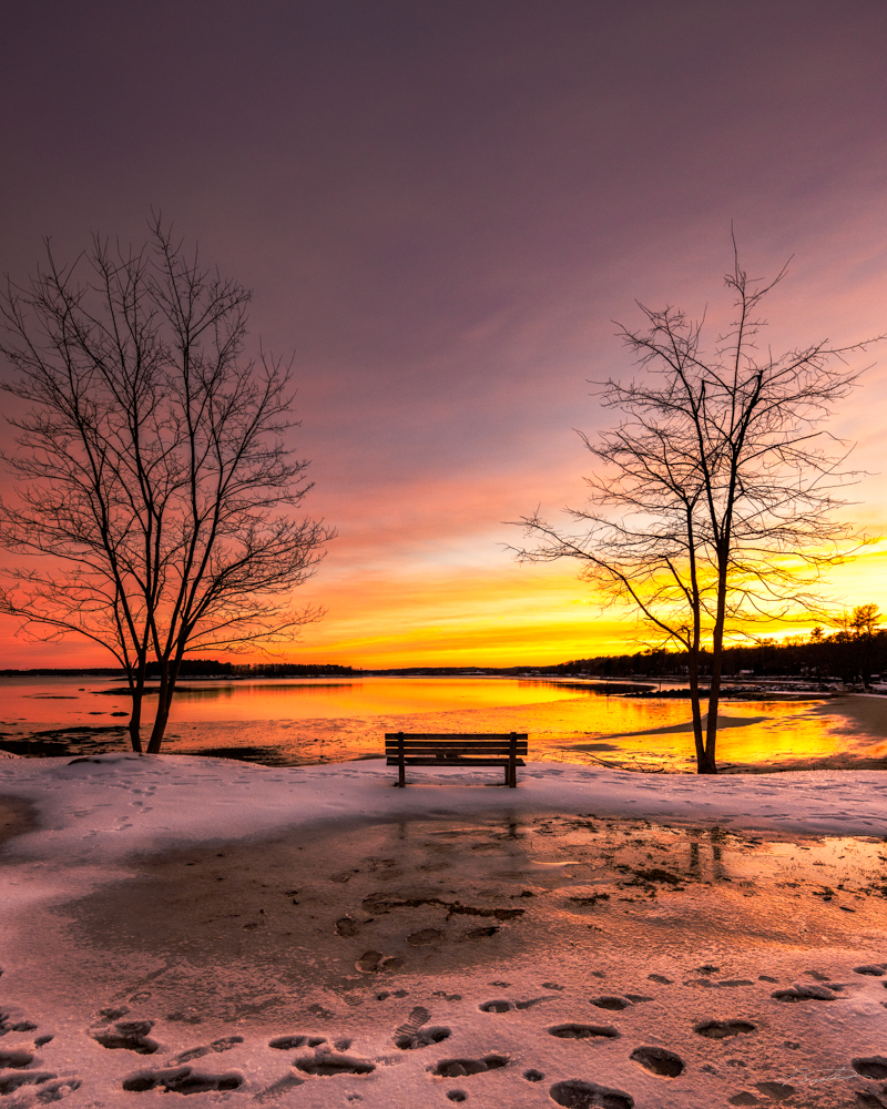 Notes: Spring sunset at Winslow Memorial Park with footprints in the snow behind one of the memorial benches.